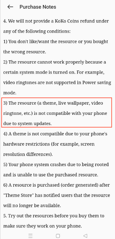 Due to system updates, a few resources (themes, live wallpapers, video ringtones, etc.) may not be compatible with your phone, as mentioned in the purchase notes. We apologize for any inconvenience caused and will strive to improve the compatibility of theme resources to seek the greatest match.