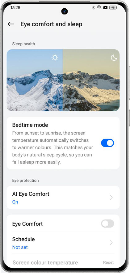 After sunset until before sunrise, the screen color temperature automatically adjusts to a warm hue, matching physiological rhythms to aid in sleep.