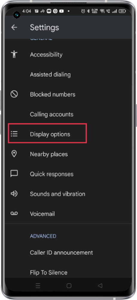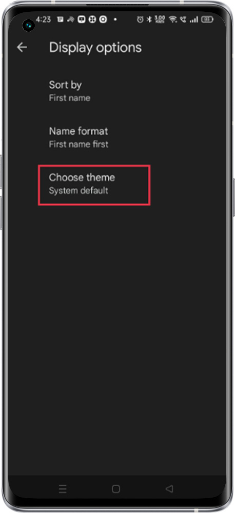 Open the Phone app > Tap More options > Setting > Display Options Choose a theme > to select the appropriate option to change the theme.