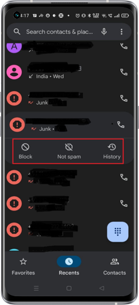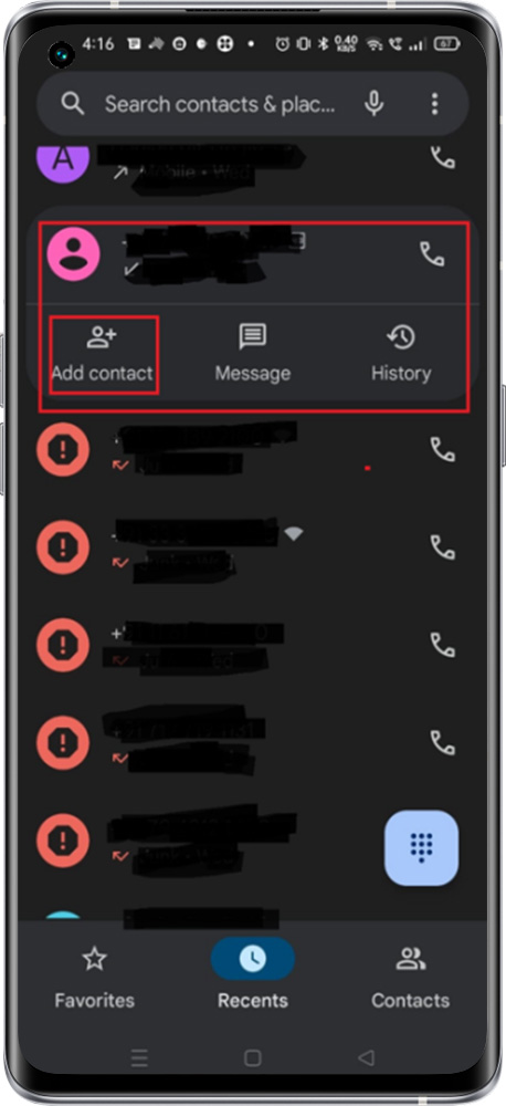 2. We can save the unfamiliar contact like incoming calls or Missed call numbers from the recent bar on the dialer screen