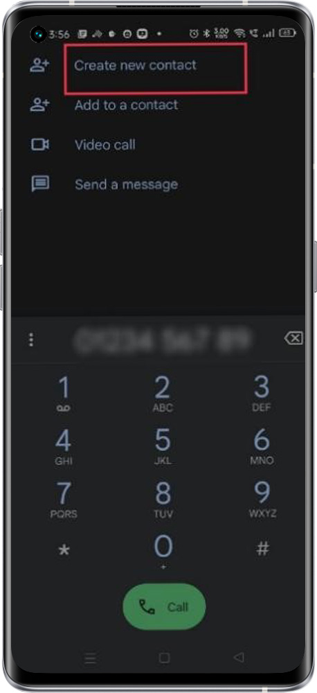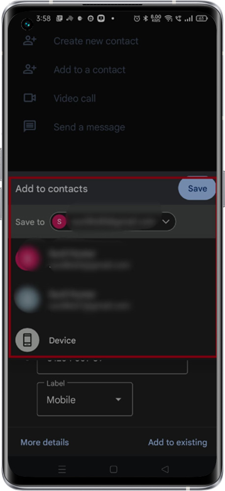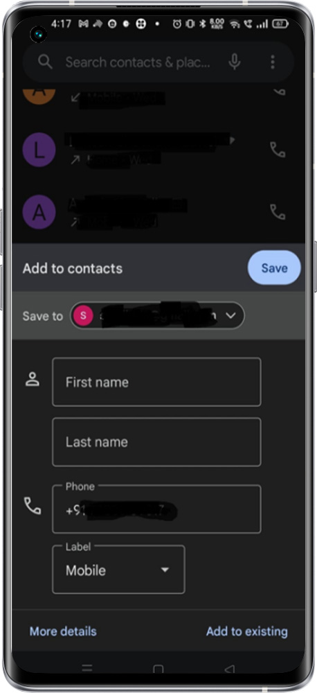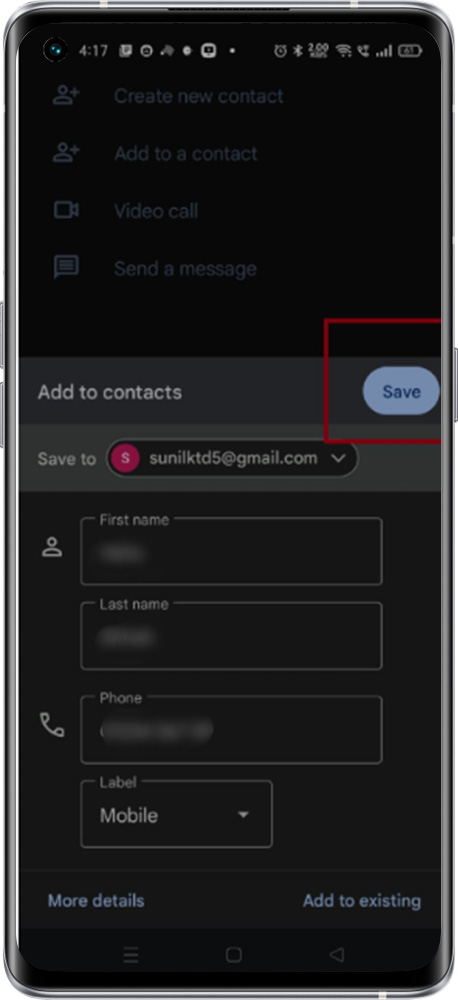 1. Open the Phone app > Type the contact number > Click on Create New Contact > Click "Save to" where you want to save the contact detail (Gmail ID or Phone Memory) > Type the First and last name of the contact and Select the Label as per the nature of the contact > Click on the Save