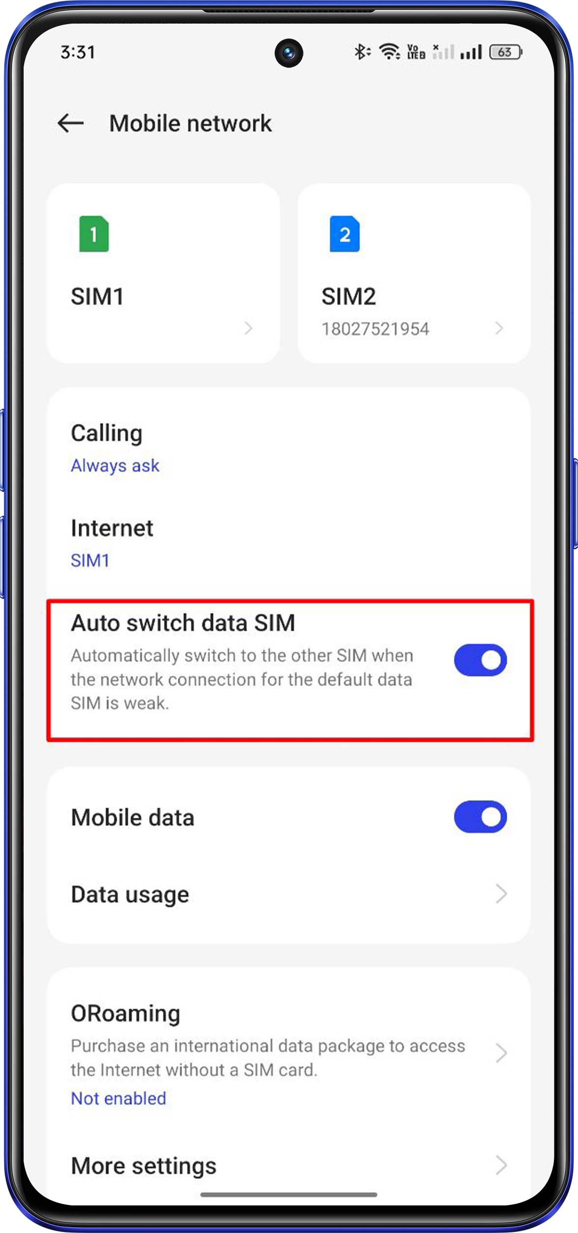 realme UI 3.0 & later UIs: Settings > Mobile network > enable Auto switch data SIM.
