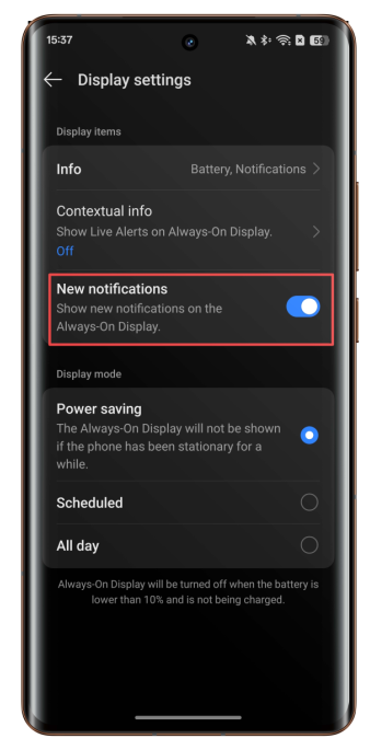 realme UI 7.0: Setting > Home screen,Lock screen & & style > Always-on-display > Display settings > New Notifications.