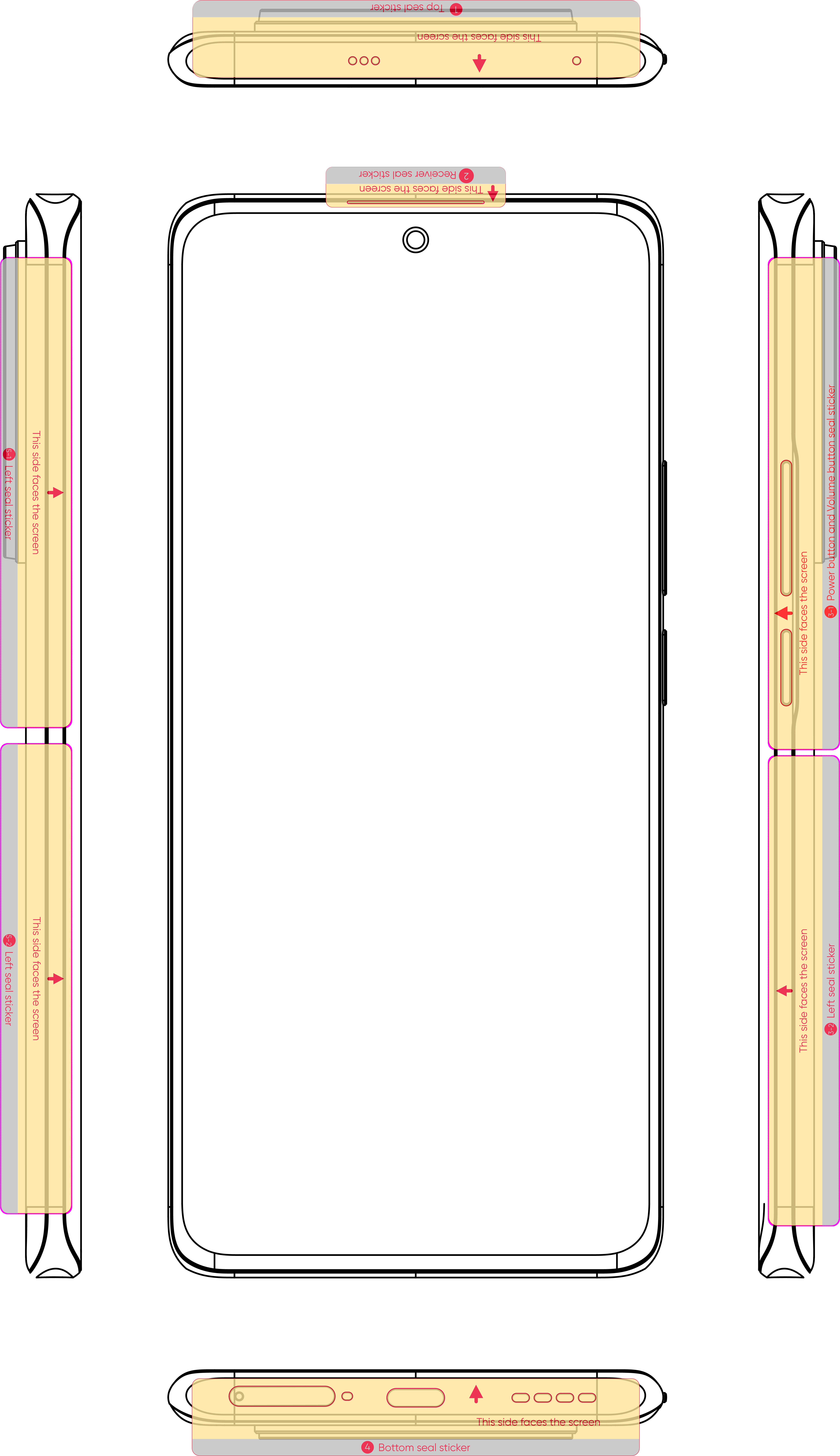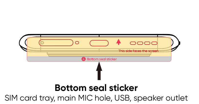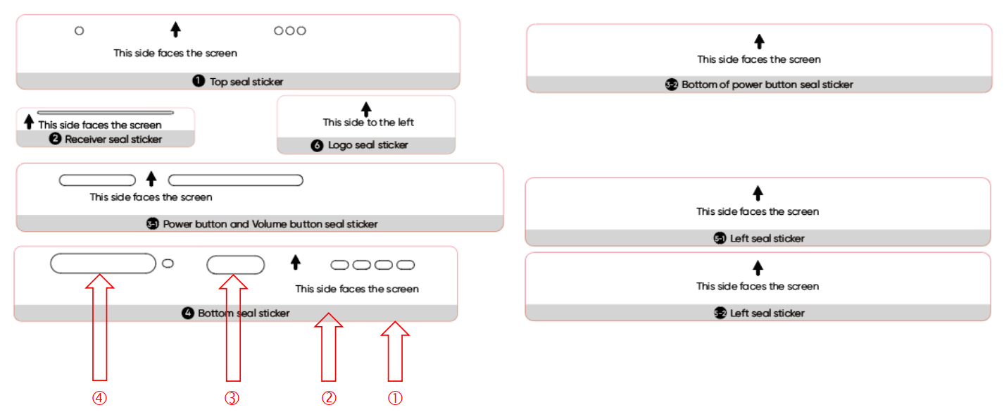 3.     Use graphics ③ and ④ to position and stick to the corresponding hole of the phone.