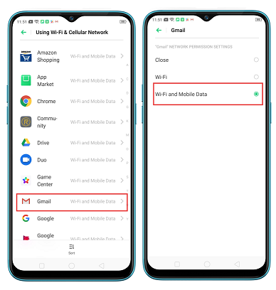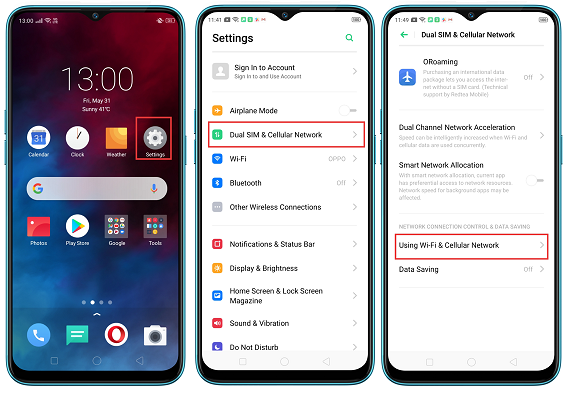 Settings --> Dual SIM & Cellular Network --> Using Wi-Fi & Cellular Network -->Click application-->select “Wi-Fi and mobile Data.”