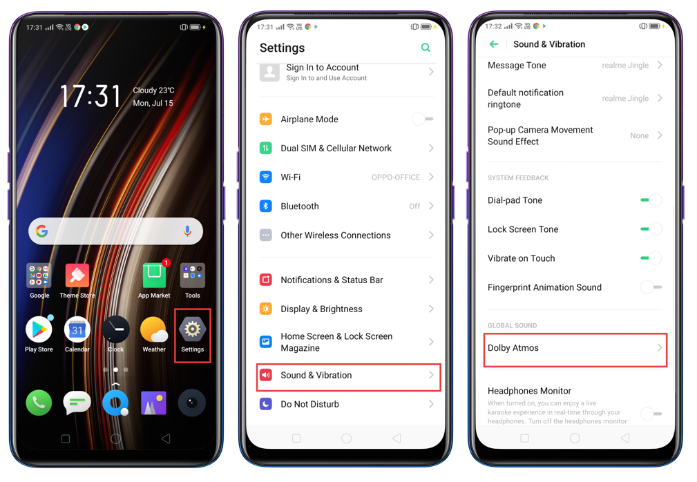 Path 1: Settings > Sound & Vibration > Dolby Atmos.