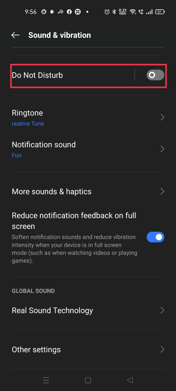 All realme UIs: Settings > Sound & vibration > Do Not Disturb > Disable Do Not Disturb